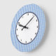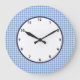 gingham check blue and white clock is perfect for a country home. This clock is based on traditional interior design found in homes all across America. This stylish and cute background will add a traditional touch to any room. . Brighten up your day with this artistic blue and white geometrical clock for a great art timepiece. Available in medium or large round clock or square clock.