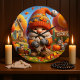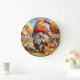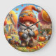 Este encantador reloj presenta una escena festiva de otoño con un gnomo grande y sonriente que barre un montón de hojas caídas. Lleva puesto un gorra de rayas rojas y naranjas y un suéter naranja acogedor. El gnome está rodeado de calabazas y ardillas que recogen bellotas. En el fondo, hay una acogedora casa amarilla y un cartel que dice "CLIMA SUAVE". La cara del reloj está fijada en un fondo de colores otoñales, todos enmarcados en un borde circular.