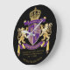 Cree su muy poseen el escudo de armas, el emblema, insignias o el escudo de la familia o con este escudo o diseño hermoso, clásico del escudo. Las rayas de la púrpura real adornan un escudo rematado con la corona de oro y flanqueado por el león o el grifo heráldico medieval. Una bandera superior a juego lleva a cabo su fecha de encargo del boda/la fecha de nacimiento/el grito del lema o de batalla. El escudo tiene espacio para sus iniciales del monograma. La bandera inferior lleva su apellido. Hay también espacio abajo para su cita, lema o mensaje preferido. Substituya el texto de la muestra por sus el propio para un regalo personalizado. Diseñé esto para trabajar para las familias, los pares y los individuos. Hace un regalo maravilloso para el día internacional de la heráldica, los fiestas medievales o Fantasía-temáticos, boda, aniversario, cumpleaños, retiro, promoción, el día de padre, despedida de soltero, ducha de la boda, graduación y otras ocasiones especiales.