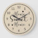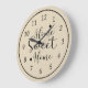 Hogar Sweet Home en escritura moderna con una simple cara de reloj numérica en el fondo del bronceado