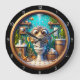 This image is a circular wall clock with a black rim and white numbers, featuring a whimsical illustration of a shocked-looking orange pufferfish wearing snorkeling goggles and reading a newspaper. while sitting on a toilet. The scene is set underwater with blue tiled walls, seaweed, starfish, and a seahorse. Bubbles float around the quirky character, all enclosed within a golden inner frame.