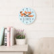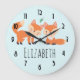 Reloj de pared con un ilustracion gráfico de 3 zorros naranjas que se ven lindos y felices. Fondo azul claro. Personalice con un nombre.
