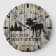 Un diseño rústico, único, personalizado y único, presenta un fondo falso de madera con pinos, un alce y las palabras "LOS WILLIAMSONS VIVIENDO EN LA MONTAÑA TIME EST. 20XX" en tipografía negra. Personalice este reloj agregando su propia información personal. Hace un gran regalo de boda, aniversario o de cambio de hogar. Haga clic en "personalizar esta plantilla" para cambiar los nombres y las fuentes para crear un diseño único de un tipo. Qué lindo accesorio para tu sala de estar, dormitorio o habitación familiar. Si necesitas ayuda con la personalización, envíame un correo electrónico a ybnormalone @gmail.com. Gracias por detenerse en www.zazzle.com/WhisperingPines. ©Karen HallA rústico