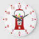 Una máquina roja del gumball del viejo estilo con algunos gumballs coloridos dentro.