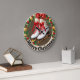 This charming round clock features a pair of white figure skates with red laces and bows, set against a cozy, burlap-textured background. The clock face is surrounded by a festive wreath of holly, berries, and gold baubles, tied at the top with a large red plaid bow. The text "Merry Christmas" runs along the bottom, making it a perfect decorative timepiece for the holiday season.
