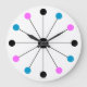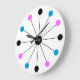 Un reloj de pared retro con un tema de la edad atómica retro de los años 50, con radios y círculos negros en verde azulado, rosa y negro, sin números. Para su habitación temática vintage, dormitorio o nave espacial.