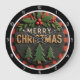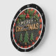 Este ilustracion circular con encanto presenta un fondo de madera oscura y perturbado. El cartel está enmarcado por un audaz borde rojo y negro de chapa búfala. Las palabras "MERRY CHRISTMAS" se muestran de forma destacada en letras talladas y tridimensionales. La parte superior está adornada con hojas verdes y bayas rojas, y la parte inferior cuenta con tres estilizados árboles de Navidad. El diseño general tiene un ambiente acogedor y artesanal.