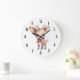 Un reloj con el ilustracion de un adorable venado. Ojos grandes orejas grandes con una cabeza grande y pequeñas cuerdas marrones. Con un gran arco rojo.