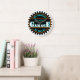 Hermoso reloj contemporáneo de arte retro en la pared con naranja brillante, escritura de tipografía azul turquesa y azul turquesa sobre fondo negro. Con espacio para personalizar o personalización con el nombre y el texto de su elección. Este caprichoso diseño hipster está hecho para el hombre de moda, que tiene una cueva o un garaje en el sótano donde se puede entretener a amigos y familiares, jugar al póquer, al hockey sobre aire, ver películas y partidos de fútbol, entre otros.