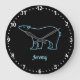 Reloj de pared divertida con contorno de oso polar "neón" y texto azul personalizable sobre fondo negro con cara de reloj blanco.