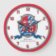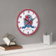 El escudo estilo Caballeros letra monograma G nombre de arte simple reloj de pared numerado en tonos rojos, azul blanco y gris. Personalice con su propio nombre y nombre, lo que significa un toque personalizado al dormitorio o la guardería de su hijo, este ejemplo es para nombres que empiezan con la letra G. Actualmente se lee Gavin White hawk. Poderoso y de aguda inteligencia. Ideal para un regalo a un niño de recién nacido, para un bautizo, un nombre para bebé o un regalo de ducha para bebés. Dibujo exclusivo en escudo, ave, corona, arte gráfico, investigación de nombres, redacción y diseño de Sarah Trett. www.sarahtrett.com para www.mylittleeden.com