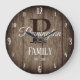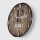 Relajante reloj familiar con fondo rústico de textura de madera falsa. Texto y texto de nombre de familia. date son todos personalizables. Gran opción de carta monogramada detrás del apellido.