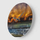 A stunning photograph looking out at the ocean with a beautiful sunrise. Waves crash on the beach as golden sun rays poke through dark storm clouds. There is a light house in the distance on the left hand side of the photo.