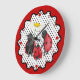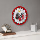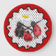 Arte caprichoso y caprichoso que presenta a mamá, papá y bebé ladybug fuera a dar un paseo por el jardín. La Sra. Ladybug tiene un paraguas de flores de margarita. Borde rojo ondulado. Los puntos rojos más grandes muestran posiciones de 12, 3, 6 y 9. Los puntos rojos más pequeños indican las otras horas en un día.