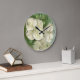 Este reloj está adornado con obras de arte en suaves colores pastel que representan tres cremosas flores de hojas de avena blancas con brotes acentuados en verde junto con números clásicos para marcar las horas.