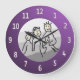 A simple round wall clock where the time circles around you or your beloved ones! Add your personal photo and this clock will transfer into a valuable item for someone you'd like to honor or surprise! The round frame is colored purple, and digits are white. There exists 9 color variations of this design - black, blue, pink, purple, lime, orange, white, silver and brass.