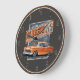 Esta es una representación de un coche clásico naranja americano con gráficos de estilo vintage en el fondo para un aspecto retro.