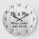 Hermoso, único y personalizado diseño presenta una madera gris rústica falsa con nombres personalizados en negro "él y ella" en un diseño superpuesto de letra script y el apellido y año establecido en una letra negrita con un efecto de fondo de madera impresa. Personalice este reloj añadiendo su información personal. Hace un gran regalo de boda, aniversario o inauguración. Haga clic en "personalizar esta plantilla" para cambiar los nombres, fuentes y colores para crear un diseño único. Qué accesorio elegante y rústico para su sala, dormitorio o sala familiar. Si necesita ayuda con la personalización, por favor envíeme un correo electrónico a ybnormalone @gmail.com. Gracias por visitar www.zazzle.com/Personal_Creations. ©Karen Hall para Personal_Creations en Zazzle.