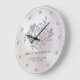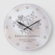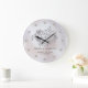 Un elegante reloj de primer aniversario de boda con monograma iridiscente y un rocío de flores y hojas en forma de corazón con brillo plateado chic. Tonos suaves sutiles con toques de brillo y su nombre y fecha de boda.