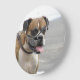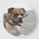 Perro boxeador en la playa con la lengua fuera.