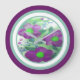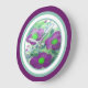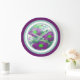 Decorative wall clock with large purple flowered design accented in lime green and teal.