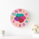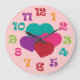 This fun design features clock numbers in a rainbow of colors, and four hearts in teal, purple, pink and red colors. To personalize the clock, click on the Customize It button. This clock works makes a great décor item for a girls room.