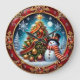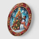 This highly decorative clock features a jolly snowman wearing a top hat and striped scarf, standing next to a magnificent Christmas tree adorned with a wide, flowing red ribbon and gold baubles. The festive winter scene, complete with a full moon and snowflakes, is framed by an ornate red and gold clock border. The design may look real due to the high detail and three-dimensional texture in the artwork.