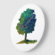 Un árbol de sombra verde terroso en muchos tonos, tiene hierba creciendo debajo, y está centrado en el reloj que tiene manecillas negras para indicar la hora.