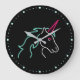 El moderno y divertido diseño de reloj de pared cuenta con un fondo negro con neón aqua / blanco / rosa cabeza unicornio y cara de reloj estilo punto.