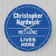 Un regalo de la plancha de pared de estilo conmemorativo divertido en forma de reloj de pared para un mecánico. Placa azul y blanca. Edite el diseño para cambiar la redacción de manera que se ajuste al destinatario del regalo.