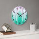 El reloj de pared redonda grande presenta arte fractal abstracto en gradiente morado y verde con números negros.