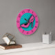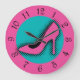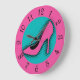 For fashion lovers, this retro style clock is printed with a high heel shoe in a pink and aqua color scheme.