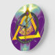 Diseño elegante, artístico, colorido. Símbolo de la antigua astrología griega, medicina y curación: Asklepian, una serpiente dorada entrelazada, una brillante piedra ametista, En el fondo del diseño hay ramas de 32 hojas y 20 bayas, que representan el número de dientes permanentes y primarios. El símbolo está rodeado por un triángulo y un círculo que forman la periferia del diseño. La letra griega del oro Δ (delta) representa la letra D en la palabra odontología. La letra negra griega Ο (omicron) representa "odonto", es decir, diente. Símbolo en luces vibrantes y ondas fractales en colores nílac, azul verde, púrpura, verde azulado, amarillo violeta. Diseño gráfico digital, modelado 3D por Bulgan Lumini (c)