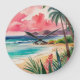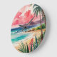 Es una playa tropical tranquila, con arena dorada y olas turquesas. Hay palmeras exuberantes bajo una puesta de sol verde azulada y rosa de ensueño. La escapada perfecta para los amantes de la playa y de la brisa marina.