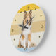 Un retrato de un hermoso Sheepdog de Shetland es la característica de este reloj. La imagen se coloca sobre un fondo retro, ligeramente perturbado y rayado de puesta de sol. Los números dorados oscuros y los marcadores en forma de diamante alrededor del perímetro hacen que el reloj sea fácil de leer. Perfecto para cualquiera que haya perdido el corazón por un Sheltie.