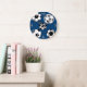 Un enrrollado, una diversión y un reloj de pared llamativo con un modelo de los balones de fútbol blancos y negros fijaron contra un fondo azul marino.
