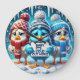 Esta encantadora cara de reloj cuenta con tres adorables pájaros de estilo personalizado apiñados para el invierno. El pájaro azul central, con un gorra y una bufanda con motivos grises y blancos, sostiene un pequeño cartel que dice "¡NADIE HACE FRÍO AQUÍ!". Está flanqueada por dos pájaros blancos, uno con un gorra y una bufanda rojas y el otro con un gorra y una bufanda azules. El fondo es una escena nevada con los músculos colgando de la parte superior y un cielo azul lleno de estrellas.