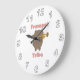 Do you like cute clocks? This clock features a brown cat playing the trumpet and the words trumpet tribe in pink. It also includes white numbers with a black outline.
