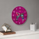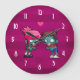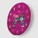 Un reloj Un lindo ilustracion con una pareja zombie, los brazos se dirigen hacia el otro. Un corazón rosado sobre sus cabezas. Se coloca sobre un fondo magenta oscuro. Agradable y adorable a la vez que espeluznante y divertida.