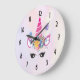 Un reloj diseñado con un unicornio rosa de moda. Decorado con un elegante cabecero de flores. Mariposas caprichosas volando por ahí. Un fondo de color morado pálido y amarillo acuático.