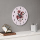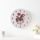 A clock with a cute retro style carousel horse. Drawn in Pretty pink colors with fancy flowers.