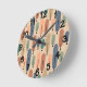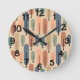 Este reloj de pared tiene un diseño moderno de mediados de siglo de largos ovales en melocotón, verde, azul, verde azulado y marrón claro con líneas negras con círculos en los extremos.