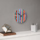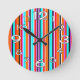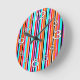 Este reloj de pared tiene un diseño simple de rayas verticales de grosor variable en rojo, naranja, morado, negro, azul claro y blanco.