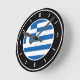 Bandera de Grecia Reloj redondo elegante con la bandera griega colocada en el centro y los números de reloj blancos preciosos en el borde del reloj. Delicioso fondo negro con elementos blancos ovalados completan el diseño, haciendo hincapié en la elegancia. La hermosa combinación de blanco y negro con la hábil integración de los colores de la bandera nacional hacen de este reloj el regalo perfecto y el gran show en la pared. © 2022 CountriesOfTheWorld