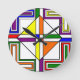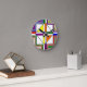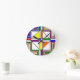 Este reloj de pared tiene un diseño Bauhaus de líneas, triángulos, diamantes y cuadrados que hacen un aspecto de vidrio teñido en colores primarios y secundarios.