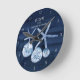 Sencillo. Moderno. "Beach Starfish Sand Dollar Moderno Blue Wood Round Clock" (Reloj redondeado de madera blanca y dorada) fue pintado con acuarela y colocado sobre un solárium blanqueado de madera blanca artesanal para una cocina costera de moda o una elegante y moderna casa de playa. Todo el arte fue creado por la artista y diseñadora con licencia internacional Audrey Jeanne Roberts, copyright.