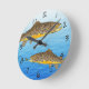 Two brown trout swimming along blue waters, while one trout is after a dry fly fishing lure. Hand drawn by artist ©Tina Hesskew of Fishing Hunting Life. Black numbers for telling the time.