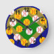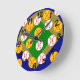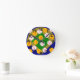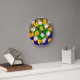 Este reloj de pared tiene un diseño temático de bola de un campo de bola hecho de diamantes y semicírculo y de pelotas de béisbol y softball hechos de círculos con hilos.