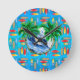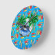 Diseño que practica surf de una persona que practica surf que monta una onda, enmarcado por las palmeras tropicales. Las tablas hawaianas retras modelaron el fondo.