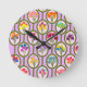 Este reloj de pared tiene un diseño moderno de mediados de siglo de cuerdas de círculos con ramos de flores en cada círculo.